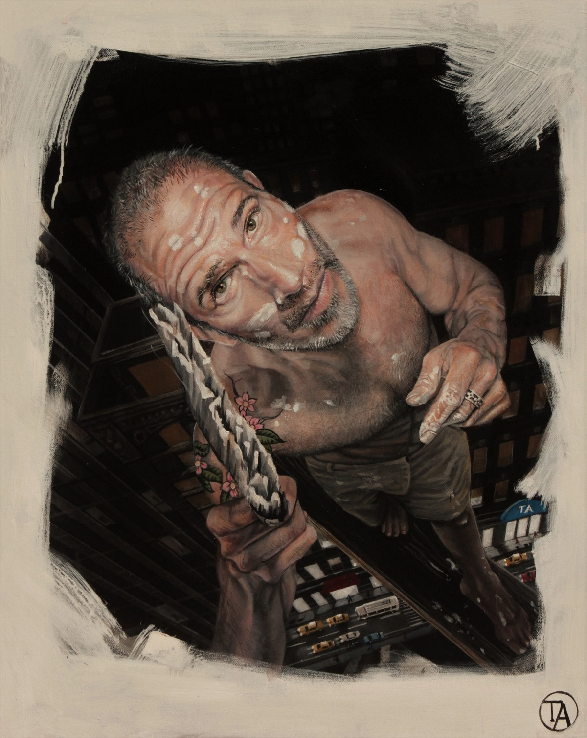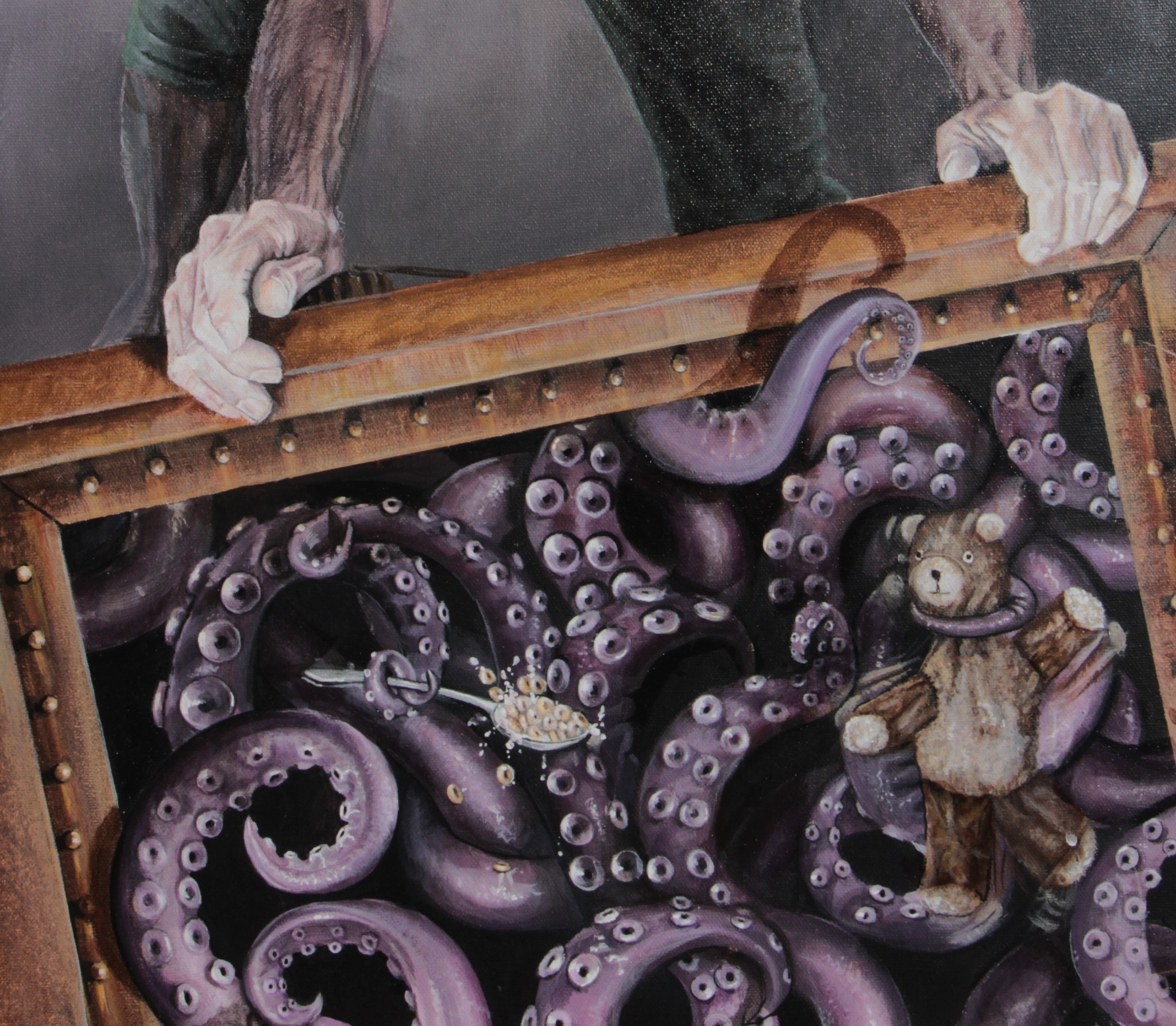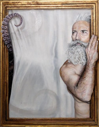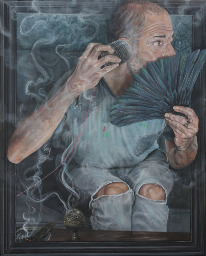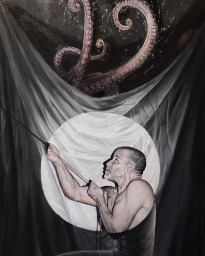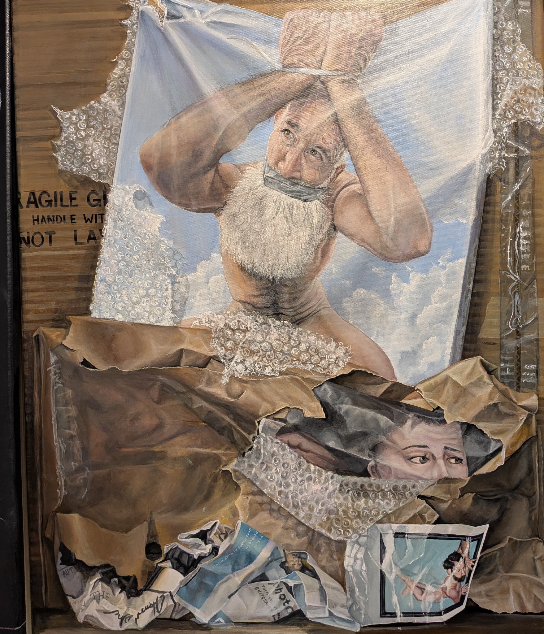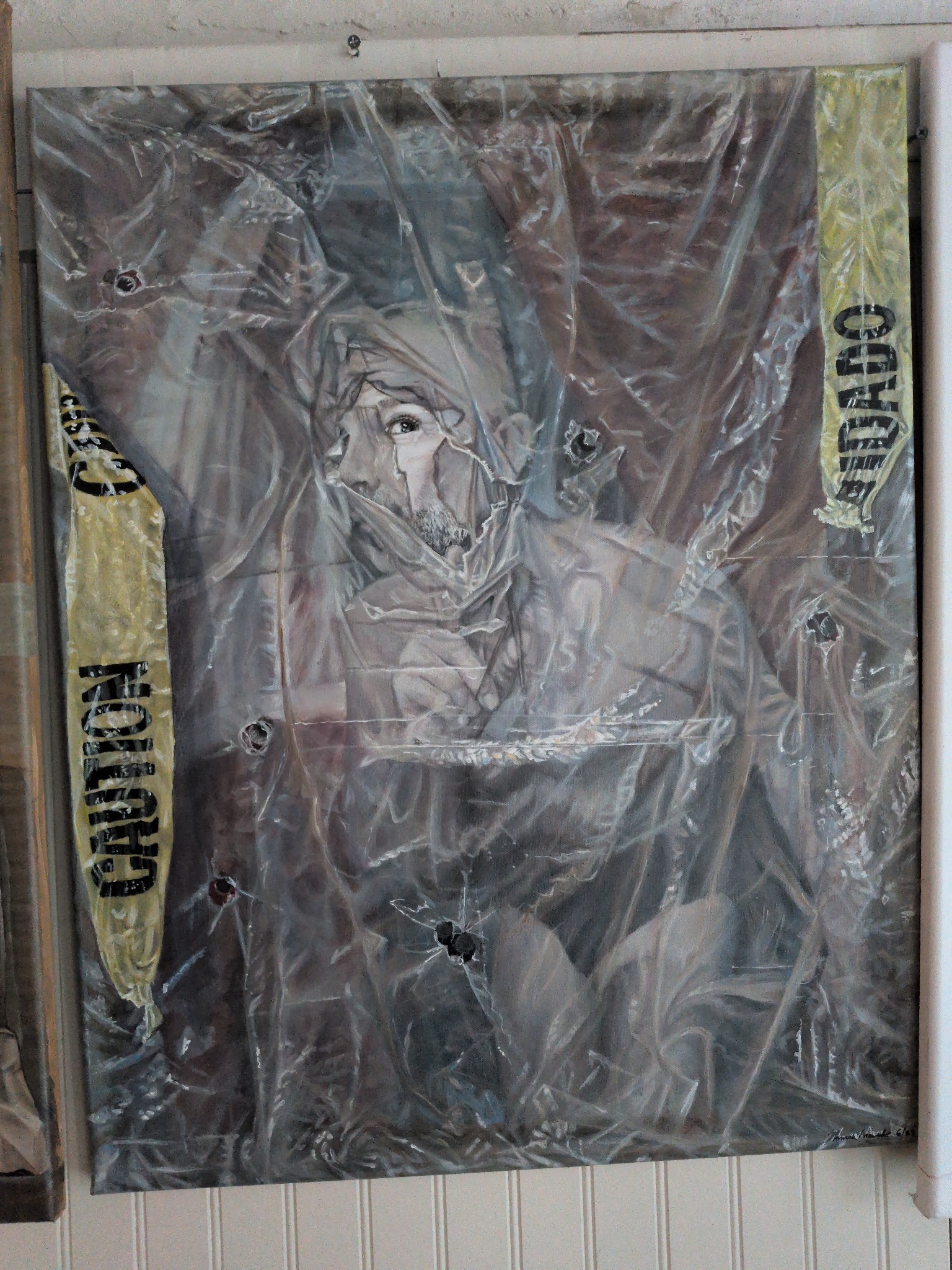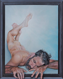 I often rely on the masculine Vulnerability of the male figure in my paintings reclaiming the figure to shine a light on the darker aspects of our psyche and society. This allows me to play with a bit of surrealism along with realistic figurative painting and some trompe L'oeil to help tell a story . Like Caravaggio who often brought the viewer further into the painting , I like to use Eye contact and the illusion of three dimension to intrigue the view to want to " tip toe" closer to see more