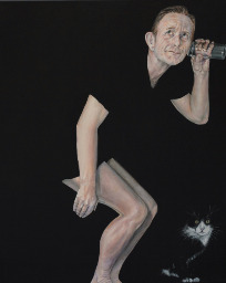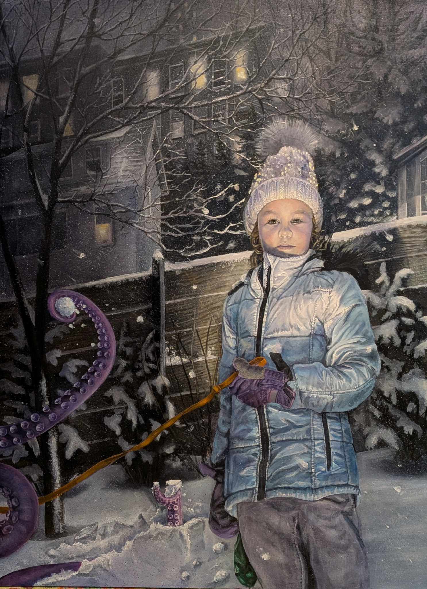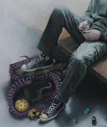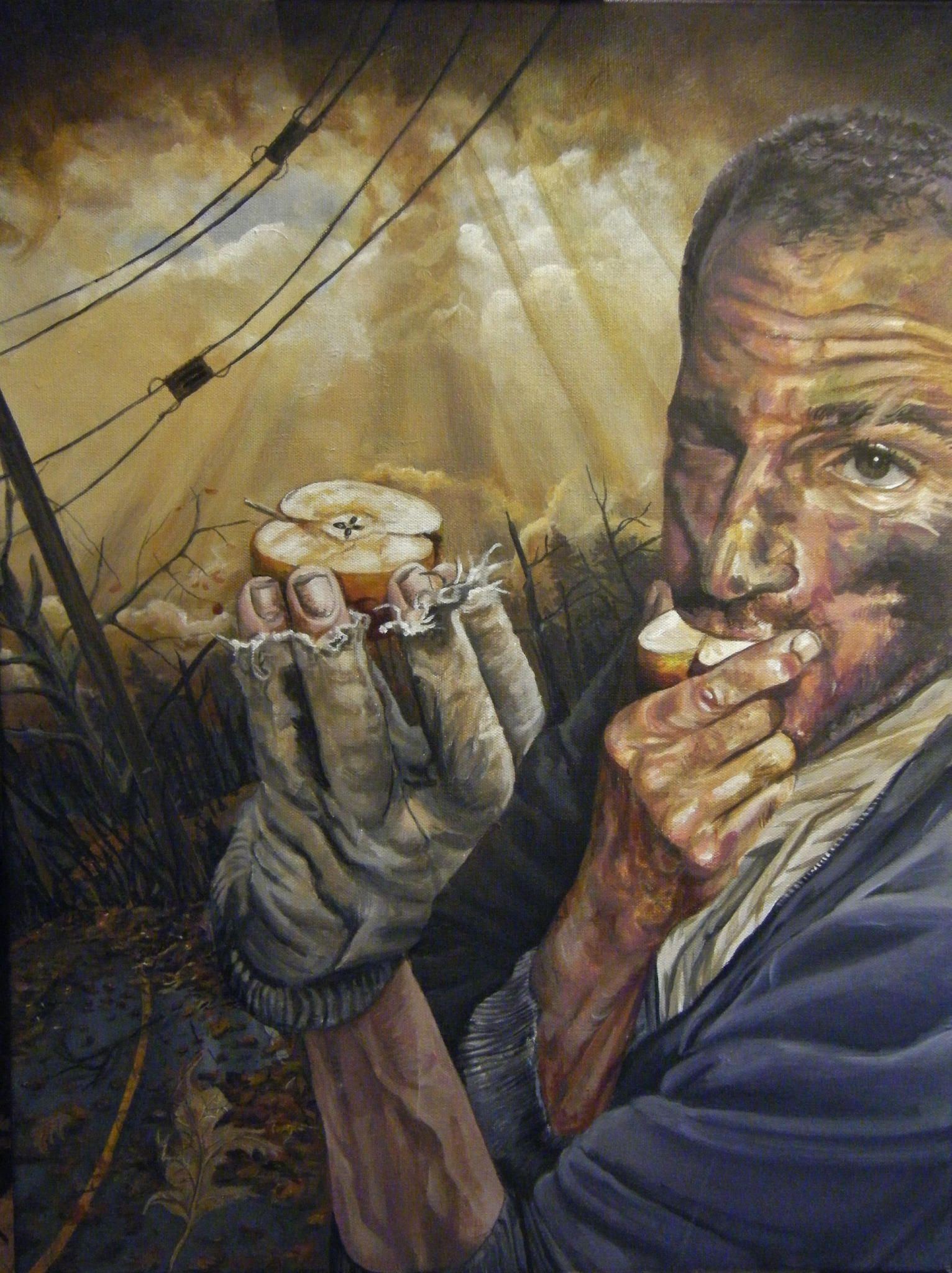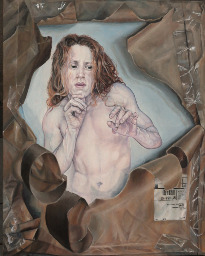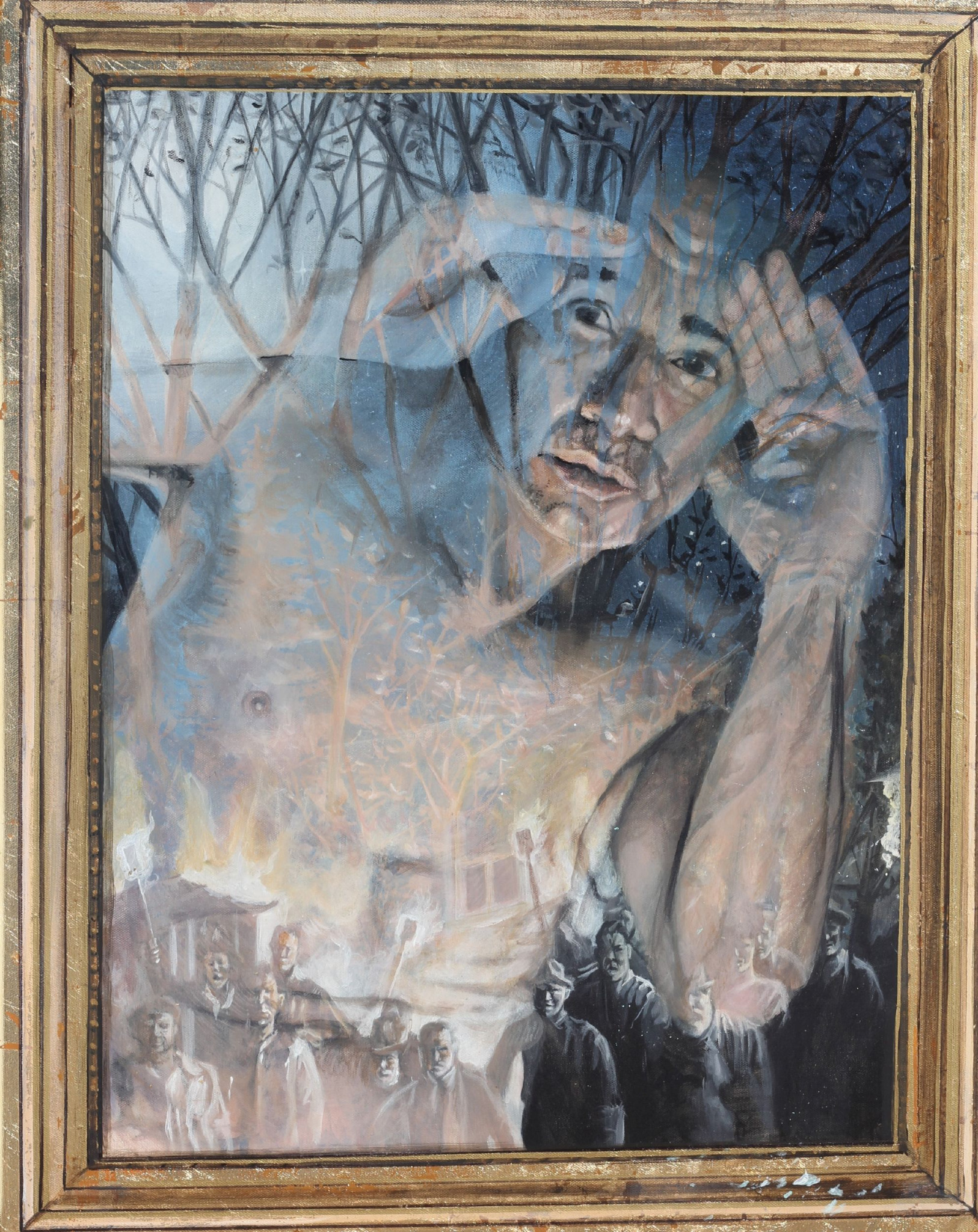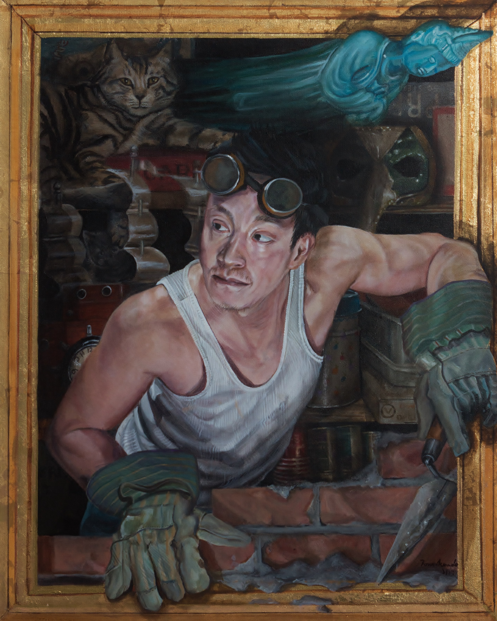 I often rely on the masculine Vulnerability of the male figure in my paintings reclaiming the figure to shine a light on the darker aspects of our psyche and society. This allows me to play with a bit of surrealism along with realistic figurative painting and some trompe L'oeil to help tell a story . Like Caravaggio who often brought the viewer further into the painting , I like to use Eye contact and the illusion of three dimension to intrigue the view to want to " tip toe" closer to see more