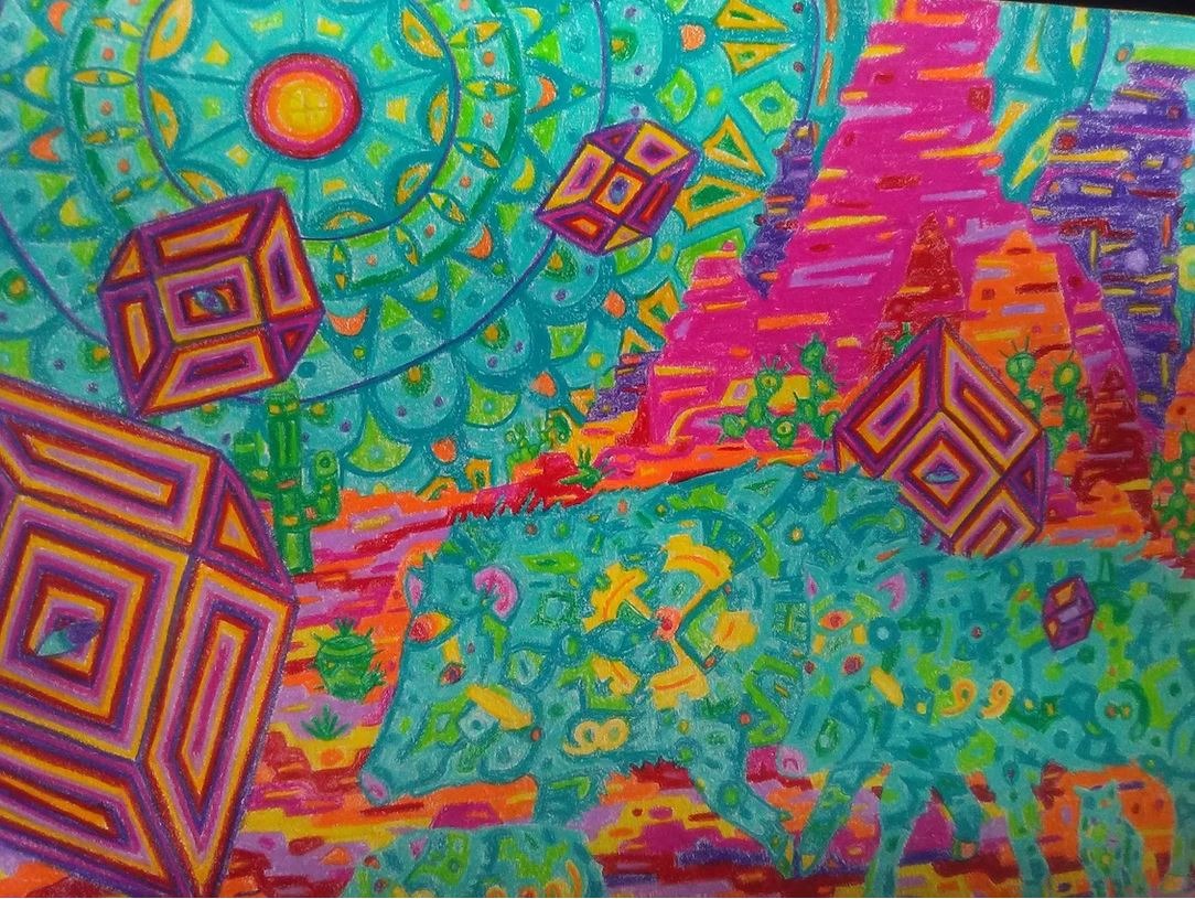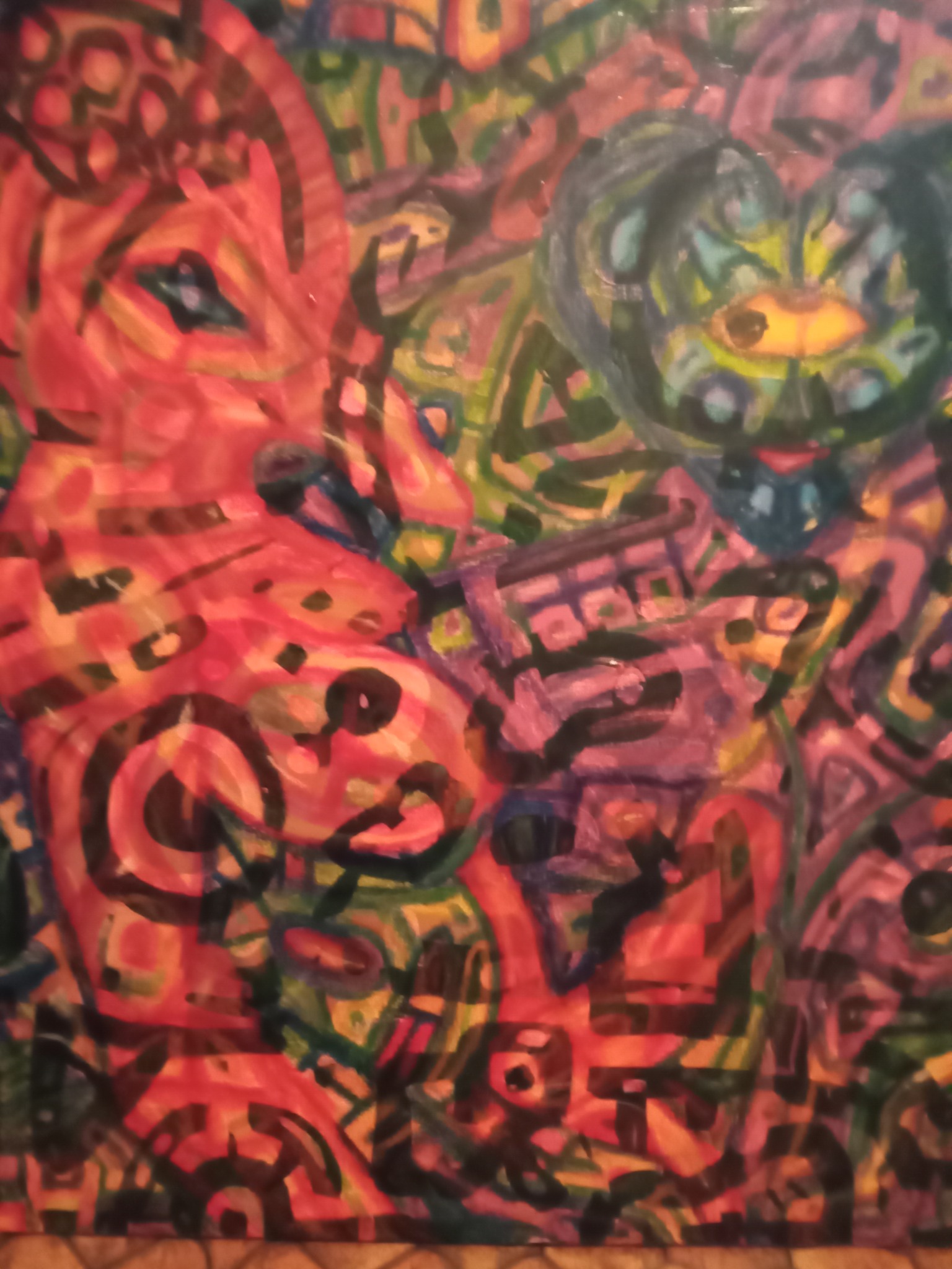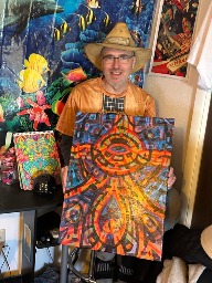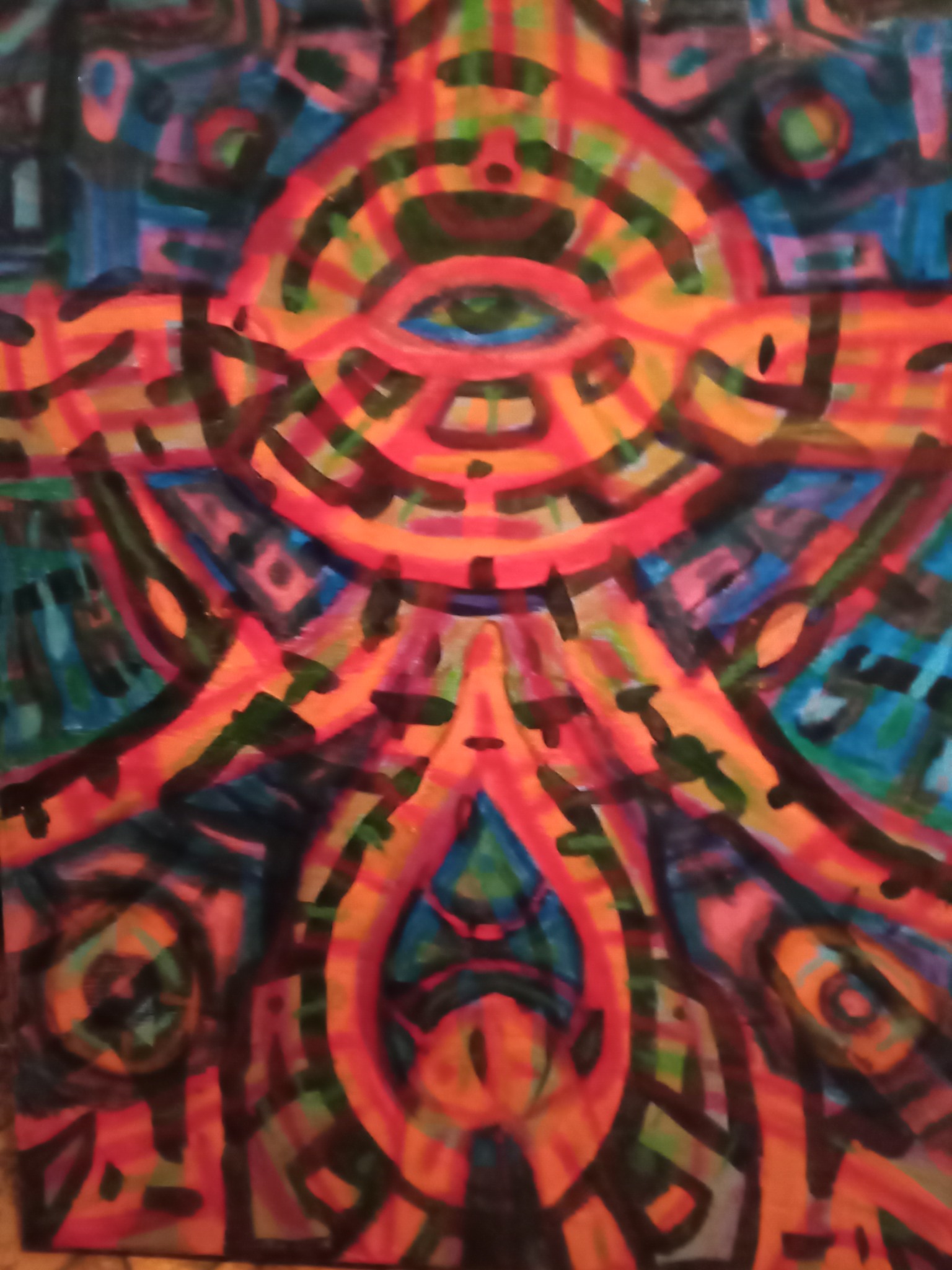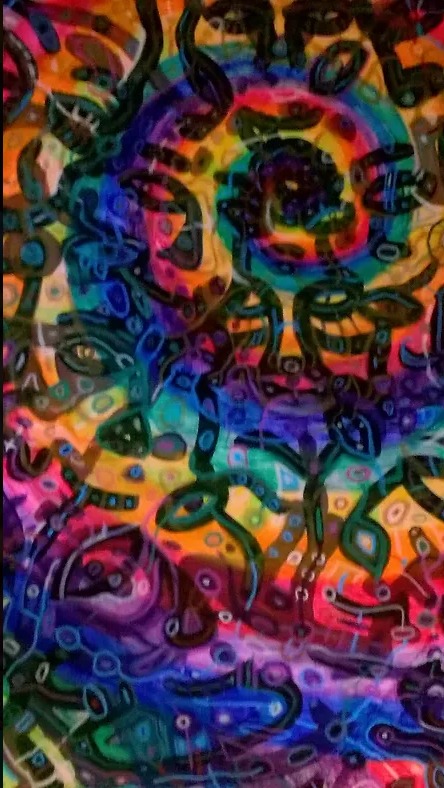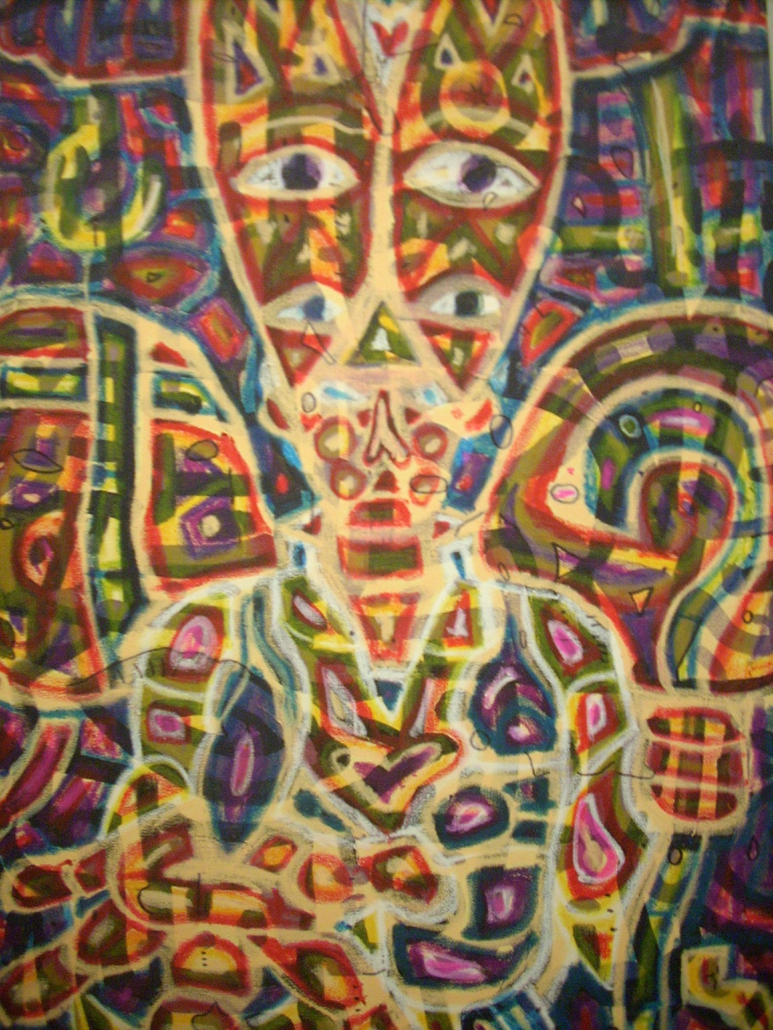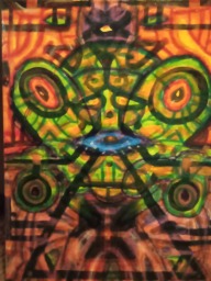 Being something of creator co-creating within the creation, I like to make art that reflects that notion, as well as stop people dead in their tracks to ponder, "what was that guy on when he came up with that?" The kind of art that when shown to different people, those people each see their own thing or find their own meaning. It pickles my brain when I show someone a piece and they see an elephant I didn't paint or they see a religious or philosophical notion that was unintended. Large Canvas.