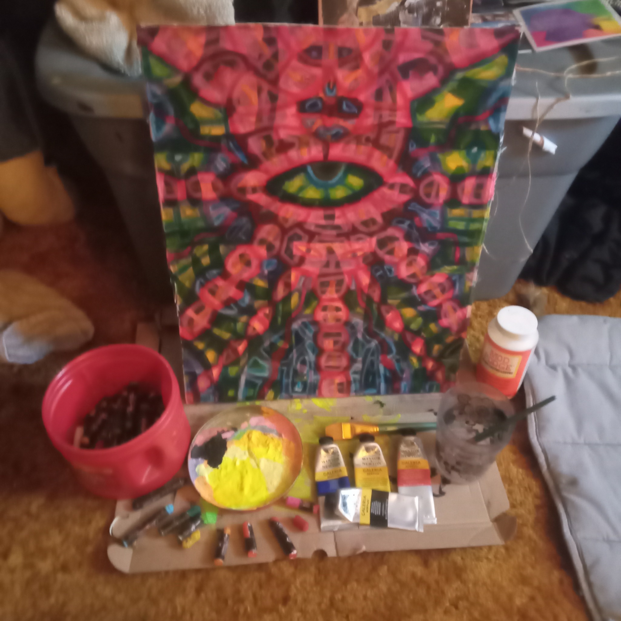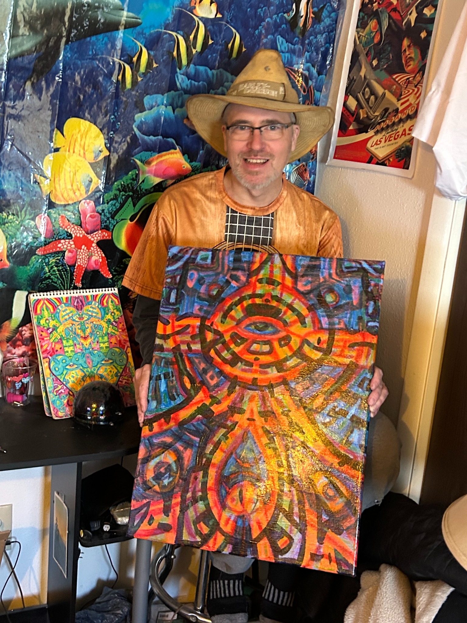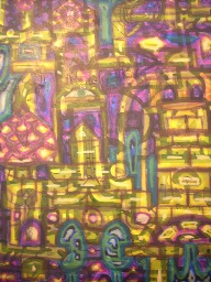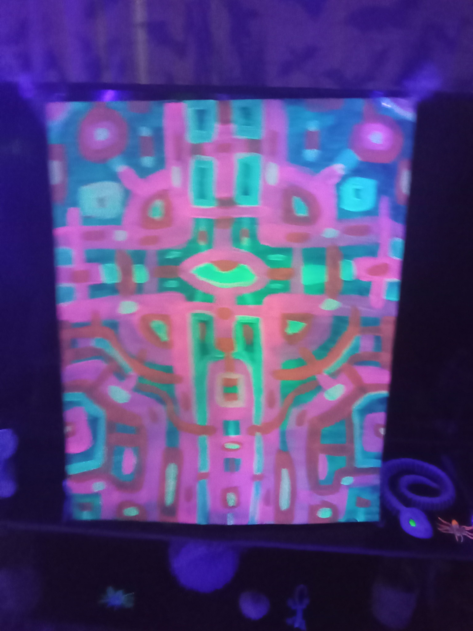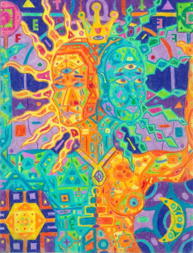 Being something of creator co-creating within the creation, I like to make art that reflects that notion, as well as stop people dead in their tracks to ponder, "what was that guy on when he came up with that?" The kind of art that when shown to different people, those people each see their own thing or find their own meaning. It pickles my brain when I show someone a piece and they see an elephant I didn't paint or they see a religious or philosophical notion that was unintended. Large Canvas.